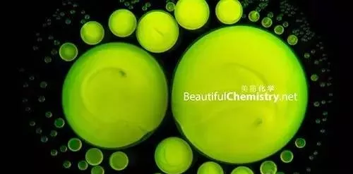 将绿色荧光棒中的化学物质混合在一起,并加入氢氧化钠溶液,生成漂亮的绿色荧光液滴。