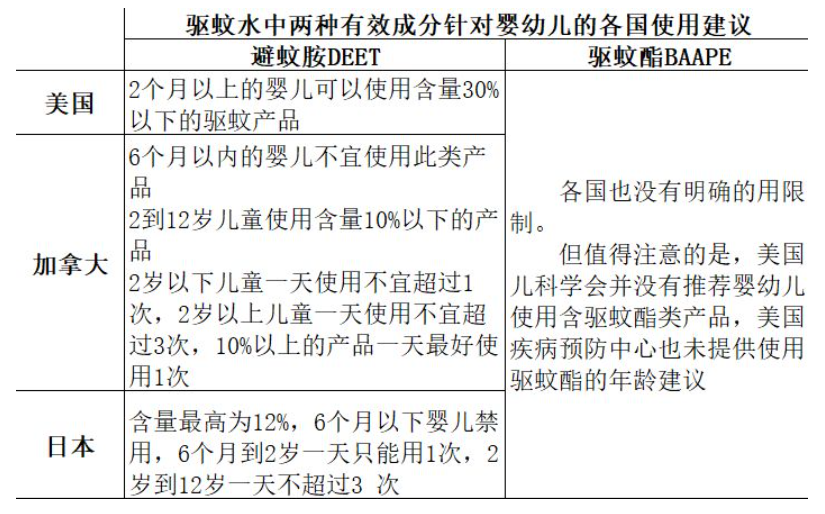 婴幼儿的抵抗能力还没有像成人一样发育完全,驱蚊的类有效成分能否对低龄儿童造成伤害,还没有比较统一的认知。小鼠实验表明,菊酯类化合物对幼鼠的神经功能有所改变。有美国学者对1600多名6-15岁的儿童进行测试,试图研究驱蚊成分中的菊酯与儿童多动症和学习障碍的关系,但是最终得出,儿童暴露在菊酯类化合物的常用浓度环境中与上述两种症状没有明显关联。