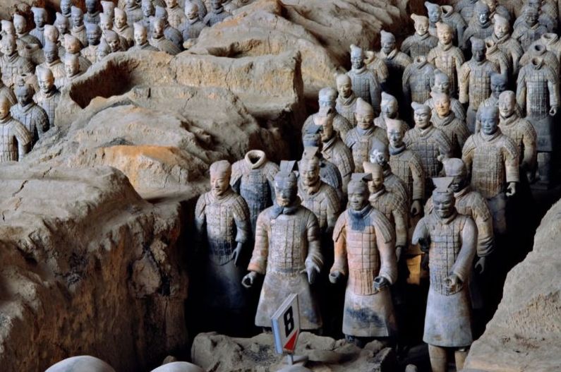 秦始皇陵兵马俑历史悠久,可以追溯到公元前三世纪晚期,其中有很多像人一样大小的陶瓷兵俑,分布在三个大坑里。他们曾经手握青铜武器,比如长矛、宝剑和弩等。几十年来,考古学家在那里挖掘了成千上万的珍贵史前武器,其中有很多几乎是崭新的(尽管把手、鞘以及类似的有机物早已腐烂)。
