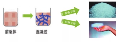 气凝胶的制备过程分为两步:1.制备湿凝胶;2.将湿凝胶通过特殊手法干燥。湿凝胶最传统的制备方法是溶胶-凝胶法。将含高化学活性组分的化合物分散在溶剂中,经过水解反应生成活性单体,活性单体聚合,形成溶胶,进而生成具有一定空间结构的凝胶。此时制作出来的凝胶有点类似于我们平时吃的果冻,紧接着将果冻状凝胶进一步进行干燥处理即可得到气凝胶。由于表面张力的作用,通常状态下,凝胶内液体的挥发会使得凝胶脆弱的骨架坍塌。而通过冷冻干燥技术进行干燥可以很好的解决这一问题。将湿凝胶在低温冷冻,接着置于真空条件下干燥。由于冷冻过程已经使得凝胶内的液体转变为固体,之后在真空环境中以升华的形式脱离凝胶骨架,这样就可以避免了液体挥发造成骨架坍塌的问题,得到我们所期待的气凝胶。