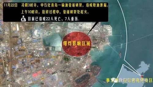 这幅图是2013年11月22日的青岛市黄岛区?;频呵幸桓鎏氐?,地下有很多长输埋地管线,用来运输石油和天然气。就在11月22日这一天,其中一根管线因为腐蚀,发生了穿孔泄漏,石油源源不断地流入地下,而且鬼使神差地流到了市政管网中去。