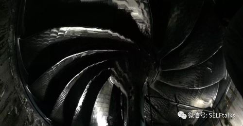 这个大家伙是三峡集团用来发电的一个水轮机。当水流冲刷叶片时,带动水轮机旋转,将动能转换成电能。水轮机很大,直径有20多米长,人站在它的面前显得非常渺小。