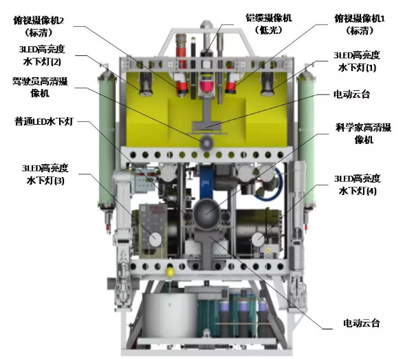 2台标清摄像机布置于水下机器人前框架,用于俯拍监视采样托架内及机械手作业情况,4台低光摄像机分别用于观察脐带缆水下状态、采样托架内工具状态、辅助观察机械手及采水瓶工作状态?!昂P?000”共配备7台水下灯,其中3台为科学家高清摄像机提供照明支持。