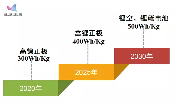 国务院颁发的《中国制造2025》提出2020 年动力电池能量密度要达到 300 Wh/Kg,2025 年达到 400 Wh/Kg,2030 年能量密度达到 500 Wh/kg。目前量产动力电池单体能量密度在 230 20 Wh/Kg,根据《中国制造2025》的要求,结合现在的技术路线,我国的科技工作者提出了使用高镍正极+准固态电解质+硅碳负极实现 300 Wh/Kg的目标;2025 年使用富锂正极+全固态电解质+硅碳/锂金属负极电池实现 400 Wh/Kg的目标,2030年使用锂空气电池、锂硫电池达到500 Wh/Kg的目标。