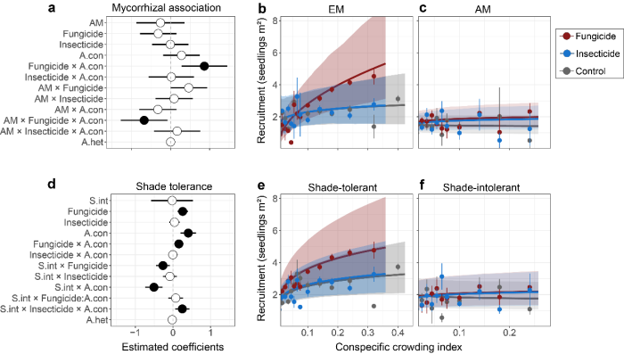然而,病原真菌和昆虫对幼苗增补和存活的影响程度,也受树种的菌根类型和耐阴性等属性的影响。病原真菌能强有力地抑制外生菌根树种和耐荫树种大树周围同种幼苗增补;而植食性昆虫则显著降低非耐荫树种大树周围的幼苗增补(图7)。