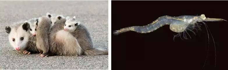 有袋类动物负鼠(左)和抱卵的雌性糠虾(右)