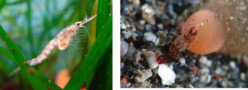 依附于海草的糠虾(左)和与??采畹目废?右)