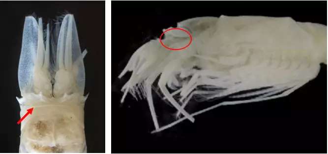 该团队利用“万泉”号深海着陆器,在马里亚纳海沟7449米深处成功采集到了一只完整的雄性糠虾个体。该个体具有着一系列特殊的形态特征:直立的额角、单瓣状的眼板、膨大的唇基、细长的尾节和独特的腹肢。