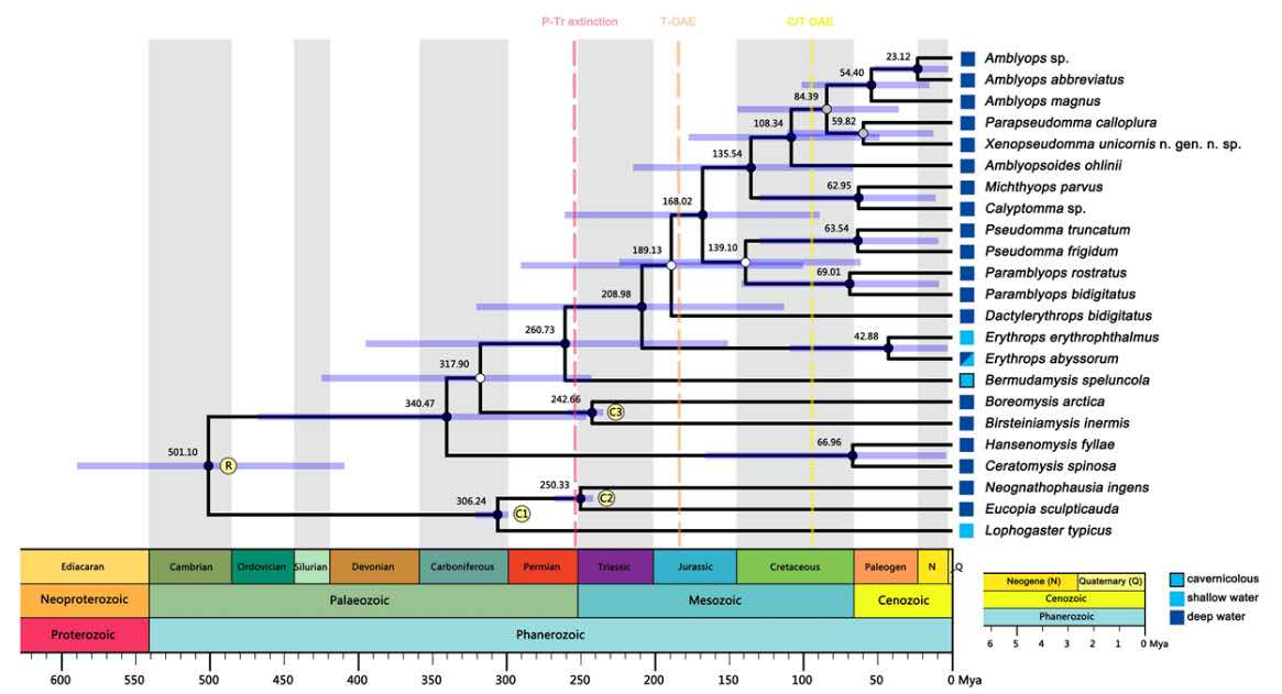 研究人员还通过化石年代标定与分子钟分析,推测糠虾类在中生代(距今约2.52亿年~6500万年前)发生过多次由浅海向深海的扩散,这恰好与地质史上3次大规模的海洋缺氧事件的时间相吻合。因此,糠虾类的祖先一次次地向深海迁移很可能是为了躲避当时缺氧的表层海水环境,并且糠虾类眼部的退化是伴随着后两次大规模深海迁移发生的。