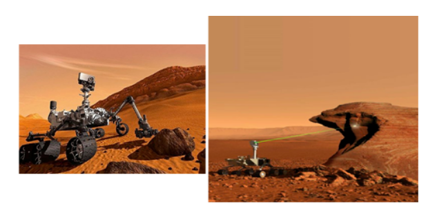 LIBS技术在地外探测中,最具影响力的是火星探测。于2011年11月发射,2012年8月成功登陆火星的“好奇者”号火星车主要采用了LIBS技术??蒲Ъ颐墙獿IBS的激光发射与光谱采集装置集成在火星车的“头部”,在进行物质探测时,只需要发射一束激光束,就可以根据在目标物质表面产生的等离子体发射光谱来对目标物质成分进行分析。