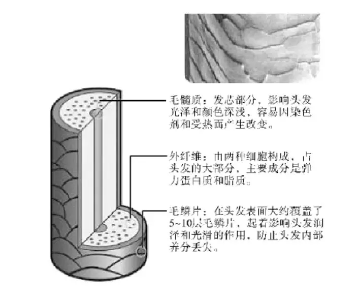 头发由毛杆和毛囊两部分组成。毛杆由内向外分为三部分:毛髓质( medulla ),毛皮质( cortex )和毛鳞片(cuticle)。毛髓质,处于头发的最内层,由互相分离的透明多角形化细胞组成,支撑头发韧性和强度;毛皮质,是毛发最主要的组成部分,由纤维状的皮质细胞组成,含有大量自然色素粒子来显示出头发的原色,它决定了头发的弹性、曲度、拉伸强度和颜色;毛鳞片,也可以称为毛小皮,分布于头发的最外层,成鳞片状由发根排列至发尾,起?;ぷ饔?,头发的粗硬、光泽也取决于本层,遇到温水及碱性物质会膨胀张开。
