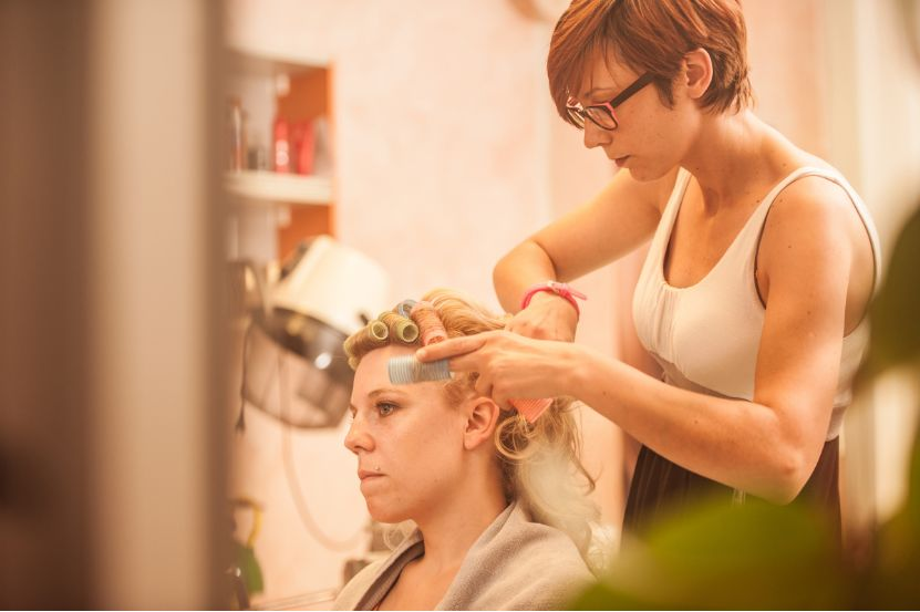 经过软化的头发会软趴趴的,Tony老师会选择不同大小的卷发杠,在头发的不同部位造型。拉直头发和烫卷原理其实是一样的,只是在改变头发形状时,用的工具不一样。拉直是在头发化学键被破坏的时候,利用拉直板让头发形状定型;而卷发则是使用卷发杠。