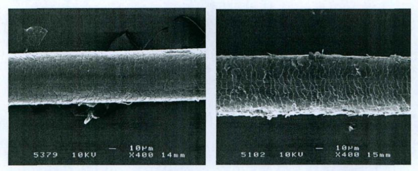 正常(左)与烫发后(右)头发扫描电镜结构对比(正常头发,毛小皮形态完整, 与毛杆贴合紧密,毛小皮的游离缘光滑,似叠瓦状;烫后的头发,毛小皮有翘起,有脱附现象,部分毛小皮边缘微卷,或呈锯齿状。)来源于参考文献[2]