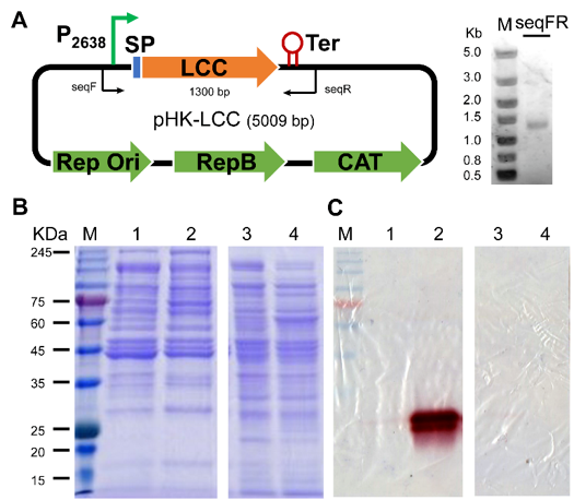图1 LCC表达质粒pHK-LCC构建以及在热纤梭菌中的活性表达及外泌