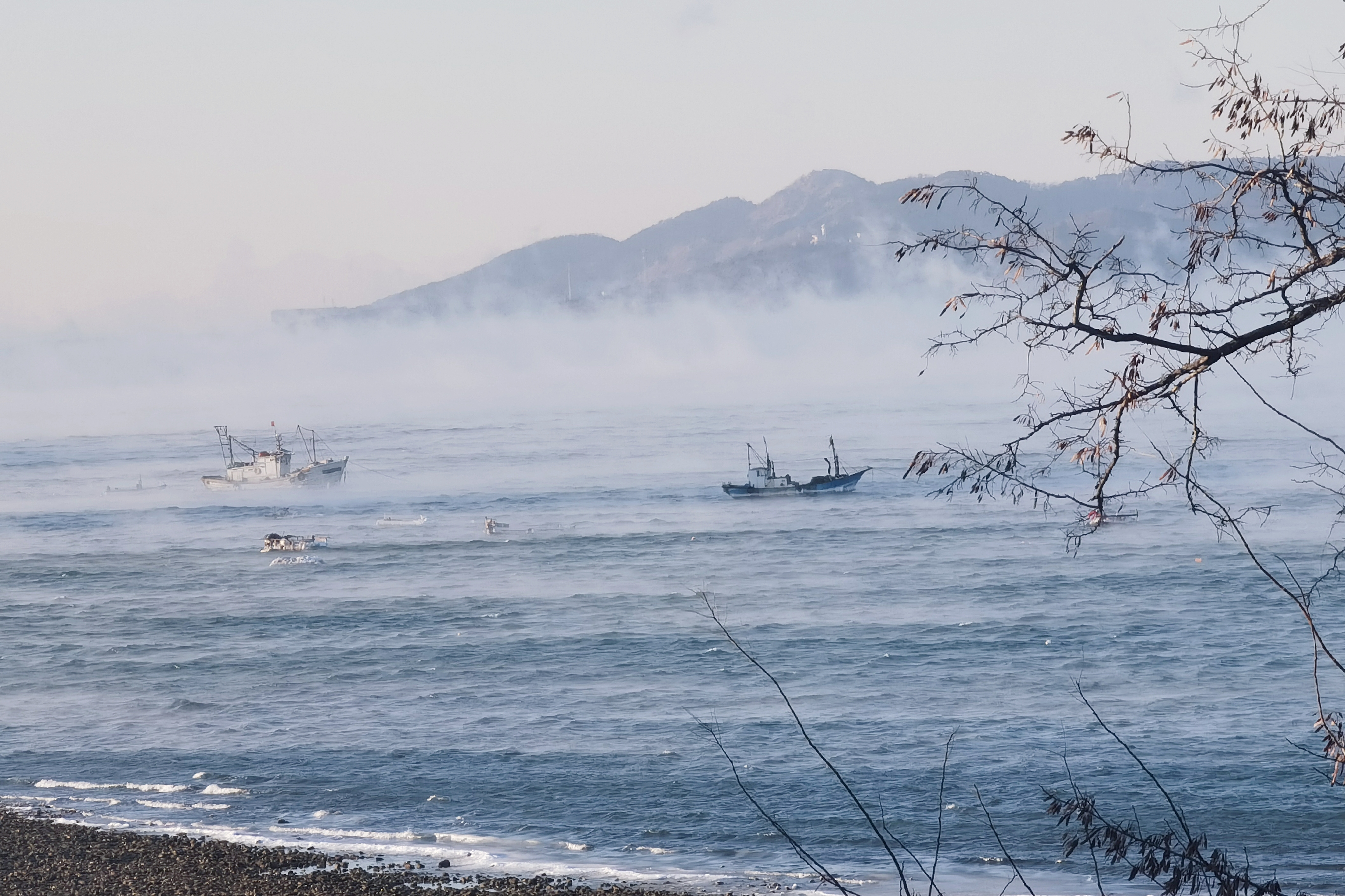 1月7日清晨,青岛近海海域像开了锅,海面上“蒸汽腾腾”,仿佛海水被煮沸了一般;船只、海岛影影绰绰,仿佛置于云层之上,如梦如幻。