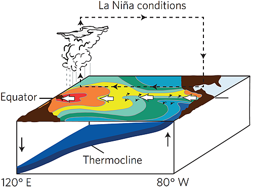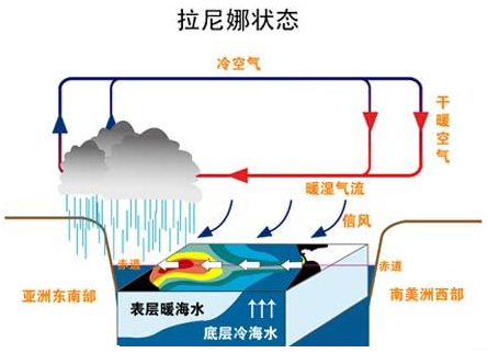 图:拉尼娜现象发生时太平洋海温及上层大气环流