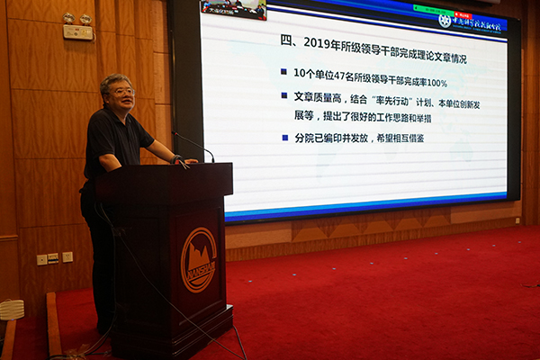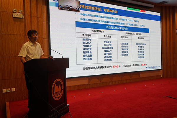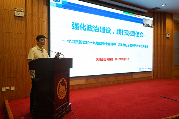 在领导班子建设???,于海斌通报了2019年度分院系统领导班子与领导人员年度考核、党建工作年度考核,各单位2019年理论中心组学习,2019年领导干部完成理论文章及参加双重组织生活会等情况,并就落实安全保密管理责任工作进行了部署;沈阳分院分党组副书记、纪检组组长郭秀银通报了2019年度分院系统单位党风廉政建设责任检查考核结果,并就2019年度分院系统各单位纪委书记考核情况进行了通报;韩恩厚作了题为“强化政治建设,践行职责使命”的反腐倡廉专题报告,报告从贯彻落实党的十九届四中全会精神、分院系统已巡视发现的共性问题、学习院党组修订印发的两项制度等三个方面,系统全面地对当前党风廉政建设的重点工作进行了阐述与解读。