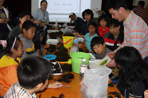 在八大关社区活动中心,同学们围坐桌旁,认真地将自己所采标本进行分类,然后根据海藻标本制作规程进行标本的制作。看着自己采来标本,经过亲自动手制作,变成一幅幅得意之作,同学们的兴奋、激动溢于言表。经过2个多小时的紧张而有序的工作,同学们共制作标本100余号,一周以后,标本完全干后,将制成书签,并将自己所制标本装入镜框作为作品摆放于家中,另外还将选出部分标本制成展板在社区、学校展出。