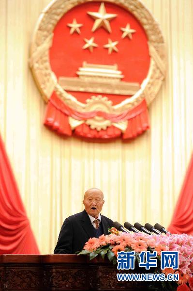 这是获得2010年度国家最高科学技术奖的师昌绪院士代表2010年度国家科学技术奖励获奖人员发言。新华社记者 李涛 摄
