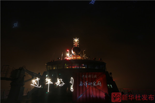 ↑这是随“科学”号科考船执行任务的队员罗青在前甲板的光影涂鸦(2月17日摄)。