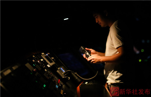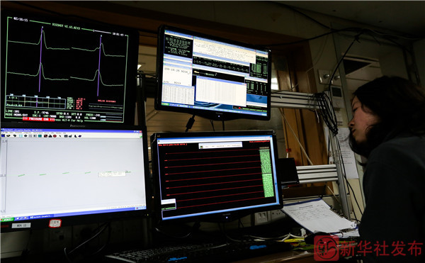 ↑船队员王林淼在“科学”号的地球物理实验室查看多道地震的数据采集情况(2月19日摄)。