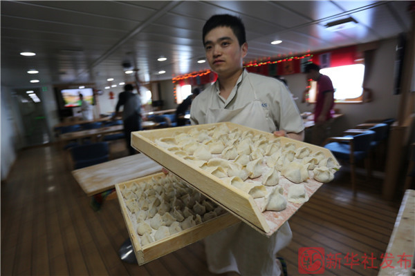 ↑“科学”号厨师陈俊把队员们刚包好的饺子运送至后厨(2月18日摄)。