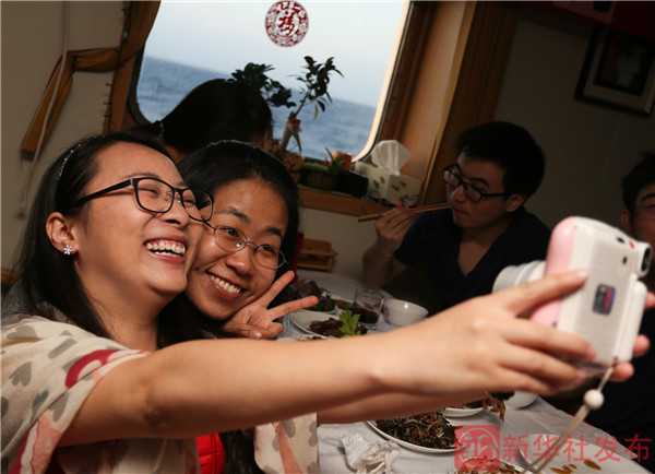 ↑在“科学”号的年夜饭上,科考队员们自拍留念(2月18日摄)。