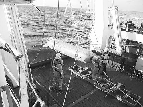 技术人员将潜水器回收至甲板