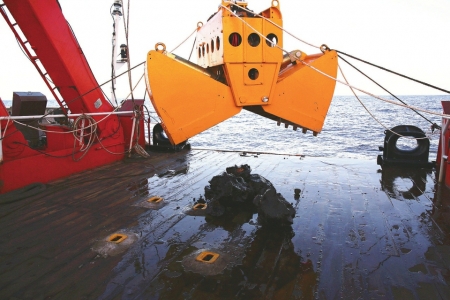 9日2时16分,电视抓斗下水。作为本航次第一抓,队员们都期待能有所收获和惊喜。经过6次调整船的位置,4时47分,抓斗抓取样品回船,共抓取到十余块大小不一的岩石样品。