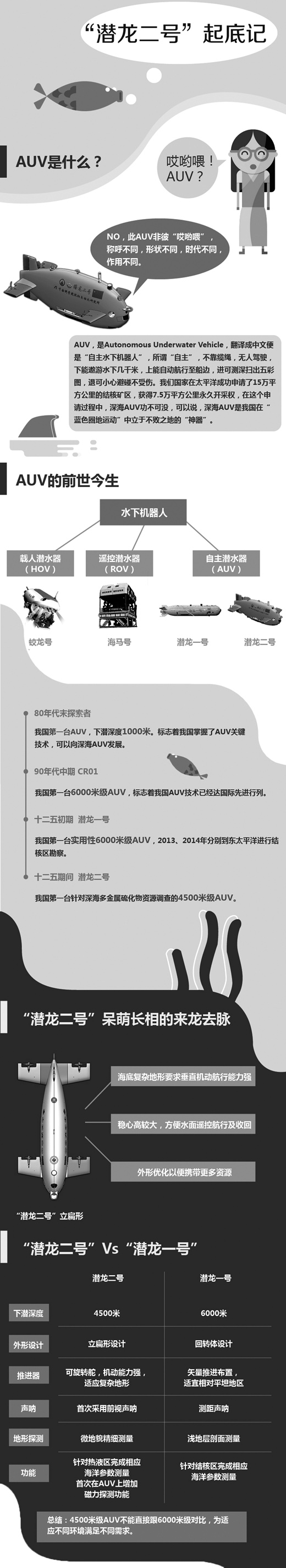 这不是一条普通的鱼,它的全名叫4500米级深海资源自主勘查系统“潜龙二号”,这是我国首台自主研发的4500米级自主水下机器人。这些天,在国际海底管理局与我国签订的多金属硫化物勘探合同区——西南印度洋一片热液区的海底,它按照预先设计的路线,首次坚持了整整30个小时的全航程探测,首次探测了海底山脉(即洋中脊)热液区,并获得了精细的三维地形地貌数据和300多张高分辨率连续照片……实现了中国深??瓶嫉亩喔觥笆状巍?。