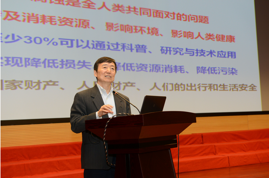 图:世界腐蚀组织主席、中国科学院沈阳分院院长、金属所韩恩厚研究员为前来参加活动的社会公众作了题为“腐蚀—人类的重要课题”的报告,倡导人们要重视腐蚀问题,用科学的武器应对腐蚀。