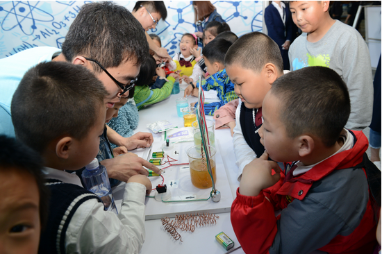 图:趣味腐蚀现象的科普实验吸引众多小朋友驻足观看