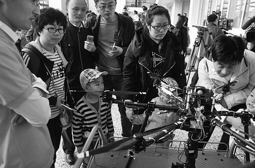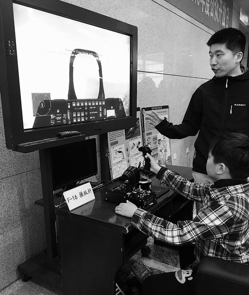 ▲小朋友在自动化所亲自试驾“无人机”。丁佳摄