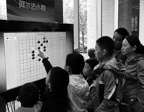 ▲同学们在计算所和“阿尔法小狗”下棋。倪思洁摄