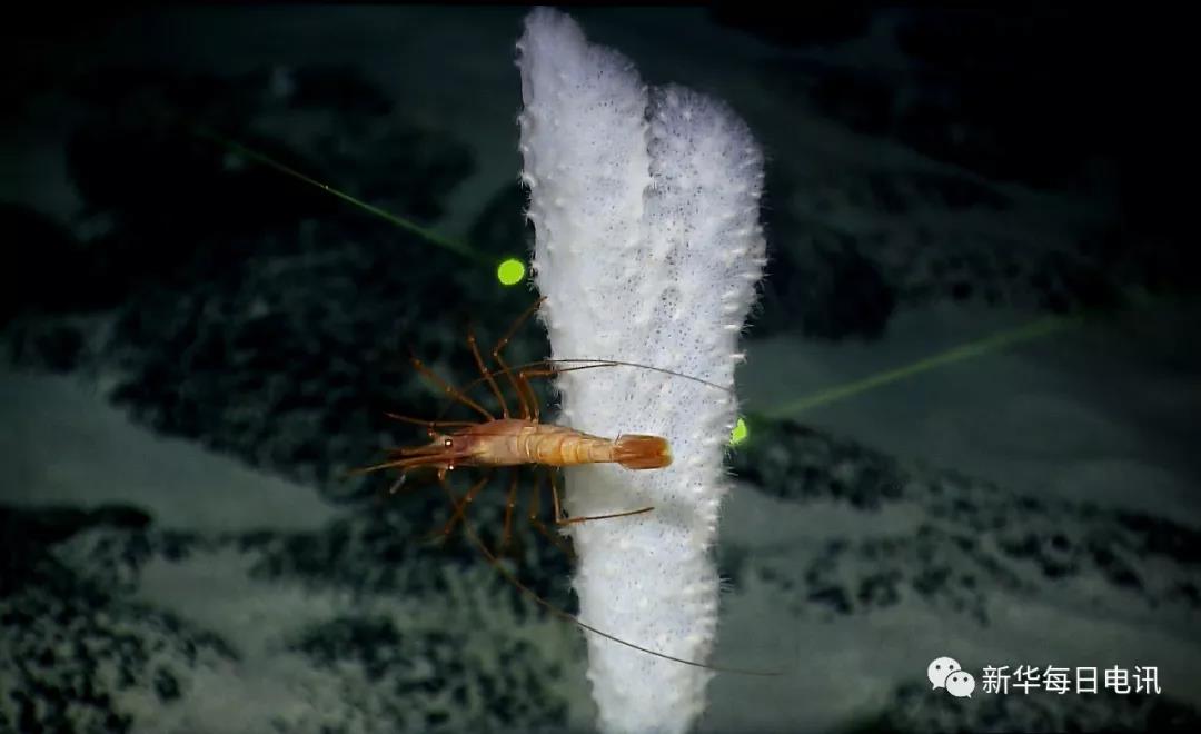 麦哲伦海山的一只深海虾附着在白色海绵上