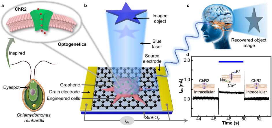 据悉,研发人员通过在普通人胚胎肾上皮细胞(HEK293)异源表达光敏感跨膜离子通道蛋白(ChR2)获得了作为生物光敏感元件的光遗传工程化细胞,其光感知过程与人眼视网膜受体感知光子的原理相似,即光诱导离子通道打开进而促使细胞去极化并产生生物电信号。