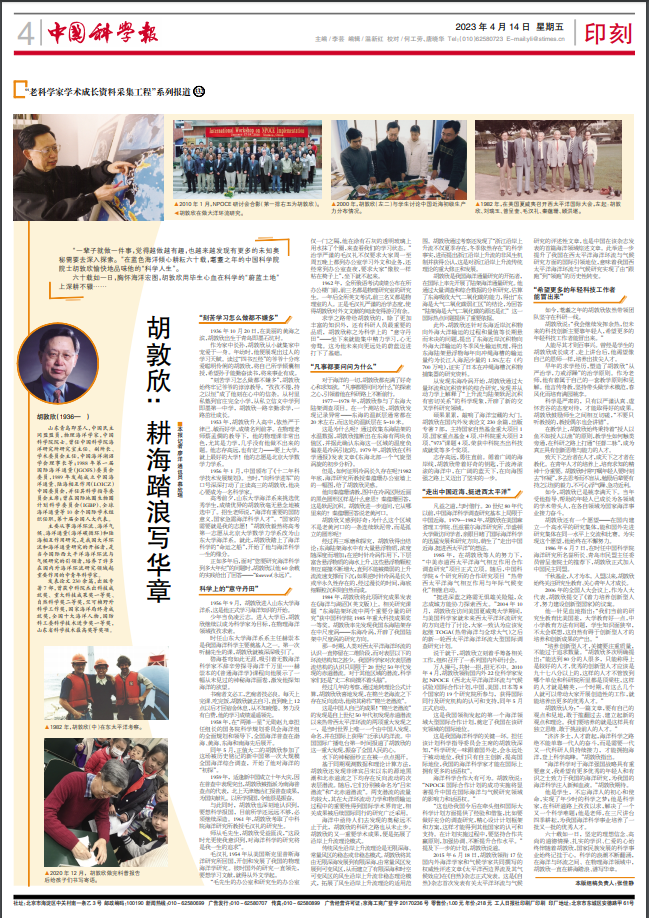 如今,胡敦欣已是桃李满天下。当年受他指导、帮助的年轻人已成长为各领域的学术带头人,在各自领域为国家海洋事业接力奋斗。