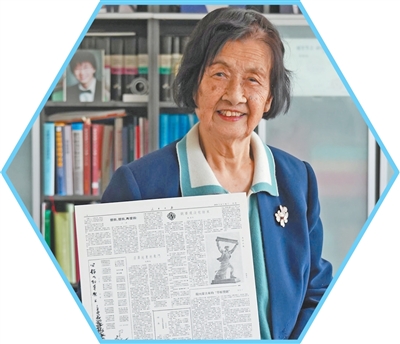 李依依与1959年8月31日的《人民日报》样例合影。她出现在当日刊发的《竞赛还没有结束》中。