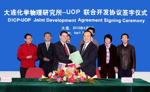 上午11时,“大连化物所—UOP联合开发协议”签字仪式举行,张涛所长和Ben A.Christolini先生作为双方代表签署了协议,并表示希望双方的合作研究项目早日取得成功。双方将致力于在生物质制化学品方面的合作。UOP公司和所内相关人员出席了签字仪式。