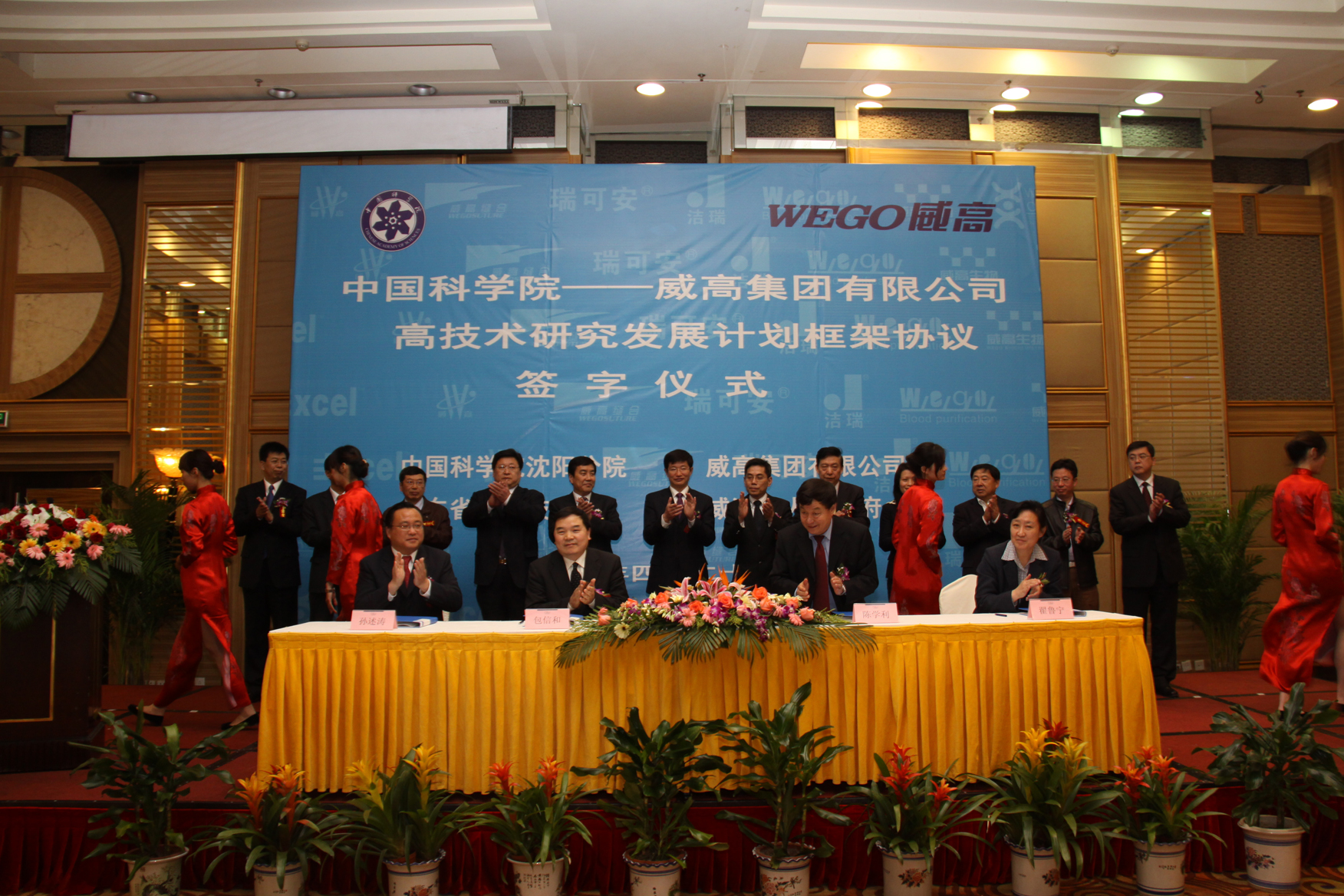 2010年4月29日,“中国科学院—威高集团有限公司高技术研究发展计划”(简称“研发计划”)框架协议签字仪式在青岛隆重举行。中国科学院方面代表副院长施尔畏、高技术局副局长刘桂菊、沈阳分院院长包信和和副院长梁波、杨胜利院士、山东中心主任王晓斌,山东省方面代表副省长李兆前、科技厅厅长翟鲁宁、省科学院党委书记李海舰、威海市市长孙述涛、威高集团董事长陈学利等出席了签约仪式。签约仪式由威海市副市长董进友主持。