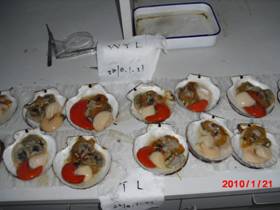 虾夷扇贝亲本保育与遗传管理关键技术研究课题 紧密结合獐子岛渔业集团2009年苗种生产情况,完成了对引进的日本贝、褡裢岛海域贝、大耗岛贝的表观性状、性腺切片、能量代谢以及病原菌与贝毒的检测等工作,发现脱毒海域贝的性腺发育优于原海域贝的性腺,暂养于脱毒海域贝的活力要高于原海域的贝;通过三次水样检测两次贝体检测发现,在大耗岛海域的贝类群体,其弧菌总数、细菌总数高于其它群体和其它海域;该研究结果已在今年的生产育苗中得到初步应用,对生产中的亲贝进行脱毒处理后育苗,取得较高的苗种育成率。