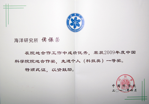 日前,中科院院地合作局对2009年度中国科学院院地合作奖先进集体和先进个人进行表彰,中科院海洋所侯保荣院士荣获2009年度中国科学院院地合作奖,先进个人(科技类)一等奖。