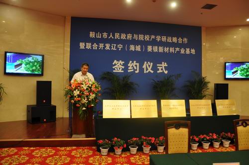 沈阳分院党组书记马思在讲话中表示,中国科学院沈阳分院与鞍山地区的合作已有多年的历史。随着沈阳经济区上升为国家战略,也为鞍山市的大发展提供了新的历史机遇,双方将在更高的层次和水平上共商新一轮合作,围绕鞍山重点支柱产业发展,特别是在钢铁产业的新技术引进、菱镁深加工和光电产业发展方面提供技术支持。共同推进鞍山地区的产业发展,推动区域创新体系建设。相信今后的合作会更加紧密,实现互惠双赢。