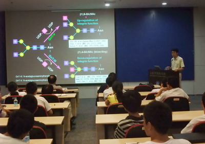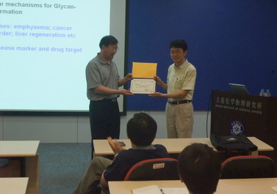 8月19日,日本东北药科大学顾建国教授应邀访问中科院大连化学物理研究所,并在生物技术部做了题为“Importance of N-glycan on Cell Adhesion and Migration and Related Disease”的学术报告,马小军研究员主持了报告会。报告会上,顾建国教授针对N-糖基化修饰在细胞生物学基础研究及临床意义上的研究进展做了详细阐述,大连化物所相关研究人员和研究生听取了报告并与顾建国教授进行了深入的交流。
