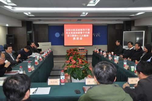 2012年11月28日,沈阳分院召开分院系统领导干部民主党派科研骨干代表学习贯彻党的十八大精神座谈会。沈阳分院院长包信和、党组书记、副院长马思、副院长马越红,工程院院士封锡盛,沈阳分院直属单位党委委员、分院系统大连化物所、金属所、沈阳应用生态所、沈阳自动化所、烟台海岸带所、沈阳计算所公司、沈阳科仪公司等单位党委书记、部分民主党派负责人、无党派代表人士和科研骨干代表等参加了座谈会。