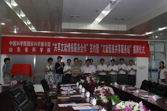 2013年8月9日上午,中科院国家科学图书馆与山东省科学院“共享文献情报服务合作”签约暨“文献信息共享服务站”揭牌仪式在山东科学院东区举行,中科院国家科学图书馆馆长张晓林、副馆长刘细文等一行5人,中科院沈阳分院院长助理、山东中心主任徐岩,山东省科学院院长王英龙、副院长刘孟德、总工程师李星洲、办公室主任赵延智、科研处处长崔雷、情报所所长杨子江等出席仪式。