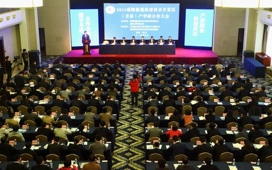 2014年4月12日,由威海临港经济技术开发区管理委员会、威海市科学技术局主办,中科院山东综合技术转化中心威海中心和威海临港经济技术开发区科技金融局承办的威海临港经济技术开发区(首届)产学研合作大会在威海举行。威海市副市长徐连新,沈阳分院院长助理、中科院山东中心主任徐岩,临港区党工委书记于文江等领导和专家出席会议。临港区有关部门、单位主要负责人,80家企业代表,区内3家银行代表等共200余人参加大会。中科院国家纳米中心、山东大学、浙江大学、吉林大学等高校院所与威海市企业现场达成30多项合作协议,集中签约16个项目。中科院长春应化所、山东大学、哈尔滨工业大学、上海交通大学、大连理工大学等单位进行了成果发布。在于文江的陪同下,徐连新、徐岩及部分企业合作专家到拓展纤维等4家企业进行了实地参观考察。
