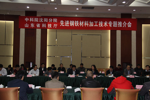 为进一步落实中科院与山东省全面合作协议和山东省传统产业转型升级指导计划,2014年11月25日,由中科院沈阳分院、山东省科技厅共同举办的中科院先进钢铁材料加工技术专题推介会在济南举行。沈阳分院副院长马越红,山东省科技厅副厅长于书良,金属研究所材料加工与模拟研究部李殿中研究员专家团队以及来自山东钢铁集团、日照钢铁集团等30余家钢铁、铸锻行业的骨干企业参加了本次推介会。