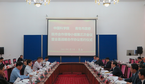 5月5日,中国科学院与青岛市人民政府第二轮全面战略合作协议在青岛签署,同时举行了中科院与青岛市的院市合作领导小组第三次会议,施尔畏副院长、科技促进发展局严庆局长、沈阳分院韩恩厚院长、青岛市张新起市长等领导,中科院各驻青机构及山东中心负责人等60余人参会。青岛市委常委、副市长王广正主持了会议。
