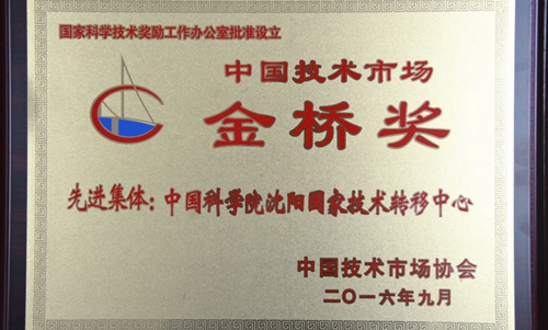 2016年11月18日,第八届中国技术市场金桥奖颁奖大会在北京人民大会堂举行。中国科学院沈阳国家技术转移中心因在构建院地合作网络体系、提升辽宁区域创新能力、服务地方产业集群发展、推动高端智库建设、推动项目转移转化、践行科普社会责任等方面开展了卓有成效的工作,荣获“第八届中国技术市场金桥奖先进集体奖”。沈阳国家技术转移中心在辽宁已经与大连、鞍山、丹东、营口等地市共建了9个分中心,目前已有41人专业从事与中科院的科技成果转移转化工作,已经成为辽宁省科技成果转化的重要力量。